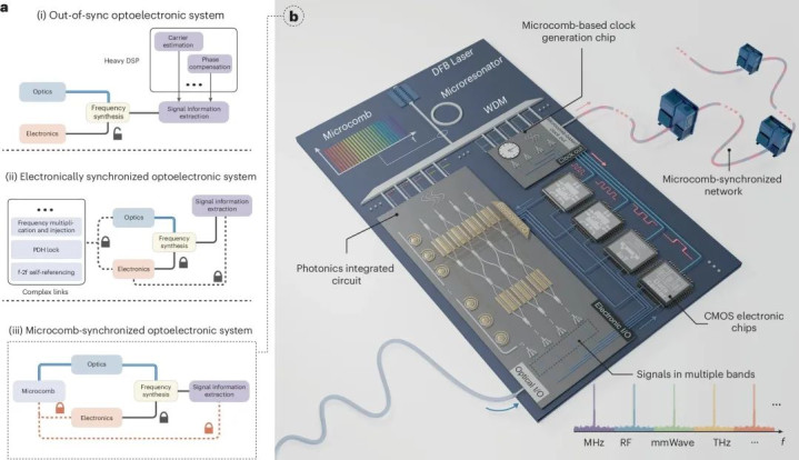 “传统芯片要想产生高速的信息处理能力,通常需基于电子的振荡器来产生时钟信号。但目前来看,该方案的速度并不理想,且会消耗大量功率,产生较高热量。同时,一个芯片往往只能产生一定频率范围内的时钟,导致不同应用,比如6G、车载毫米波雷达、GPU等,需要完全不同的芯片制造技术,从而极大提升了芯片成本。”常林告诉记者:“不同于传统方案,我们开发的光子芯片技术‘以光为媒’,通过光子产生时钟信号。我们都知道,就速度而言,光比电快很多,因此用光子时钟来处理信息,速度比电子时钟快得多。”